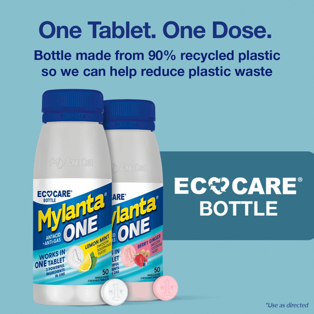 Or, take all-in-one Mylanta® ONE chewable tablets for powerful heartburn and gas relief in a single dose. They go to work at the source of symptoms so you get relief fast. And they're gentle on your body, so you can use them as directed any day you have heartburn.